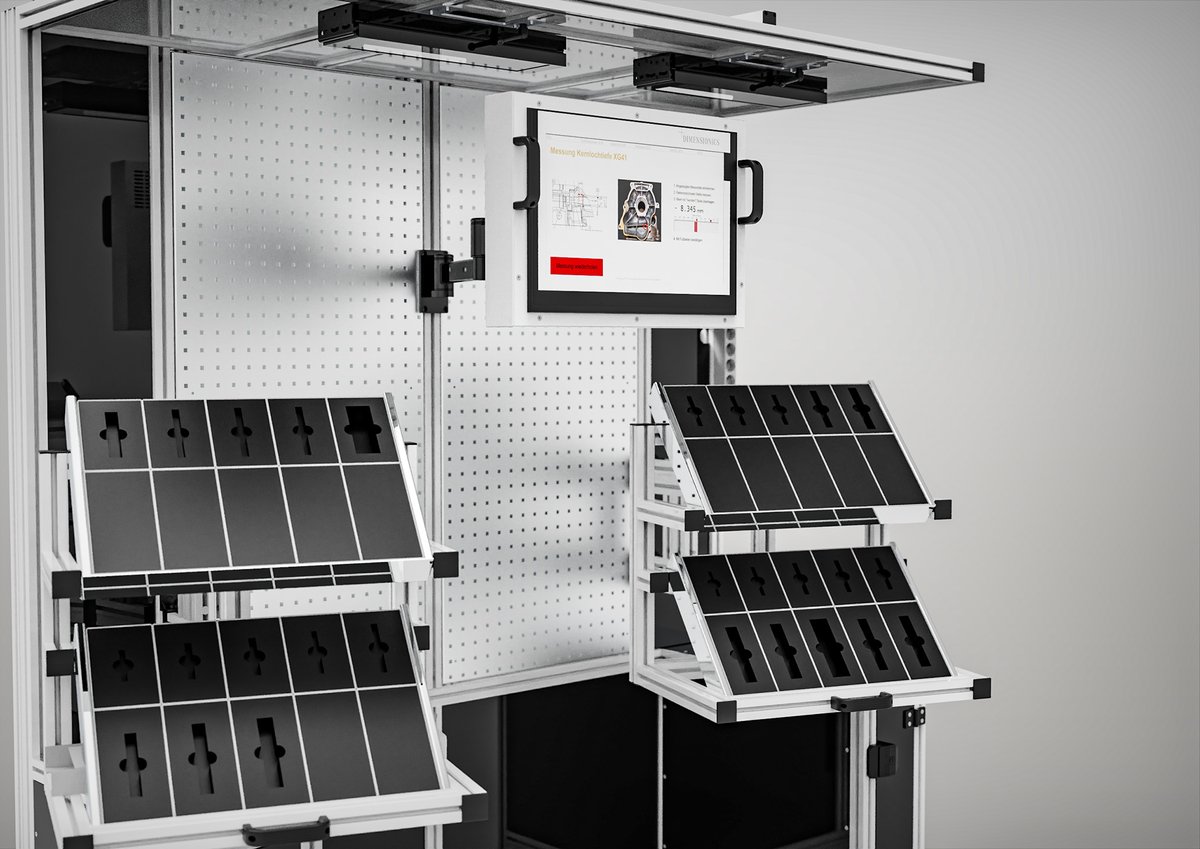 Werkzeuge und Prüfmittel können durch die Pick-to-Light-Funktion und die ergonomisch geplante Ablagestelle in kürzester Zeit erreicht werden. Messsysteme überwachen jeden Arbeitsschritt und garantieren eine fehlerfreie Montage. Prüfungen werden automatisch bestätigt und alle Messwerte vom Messtisch selbstständig dokumentiert.